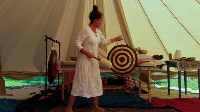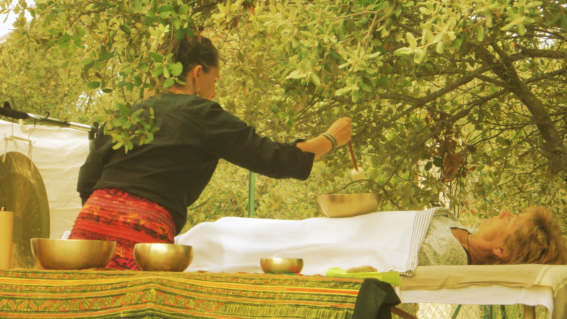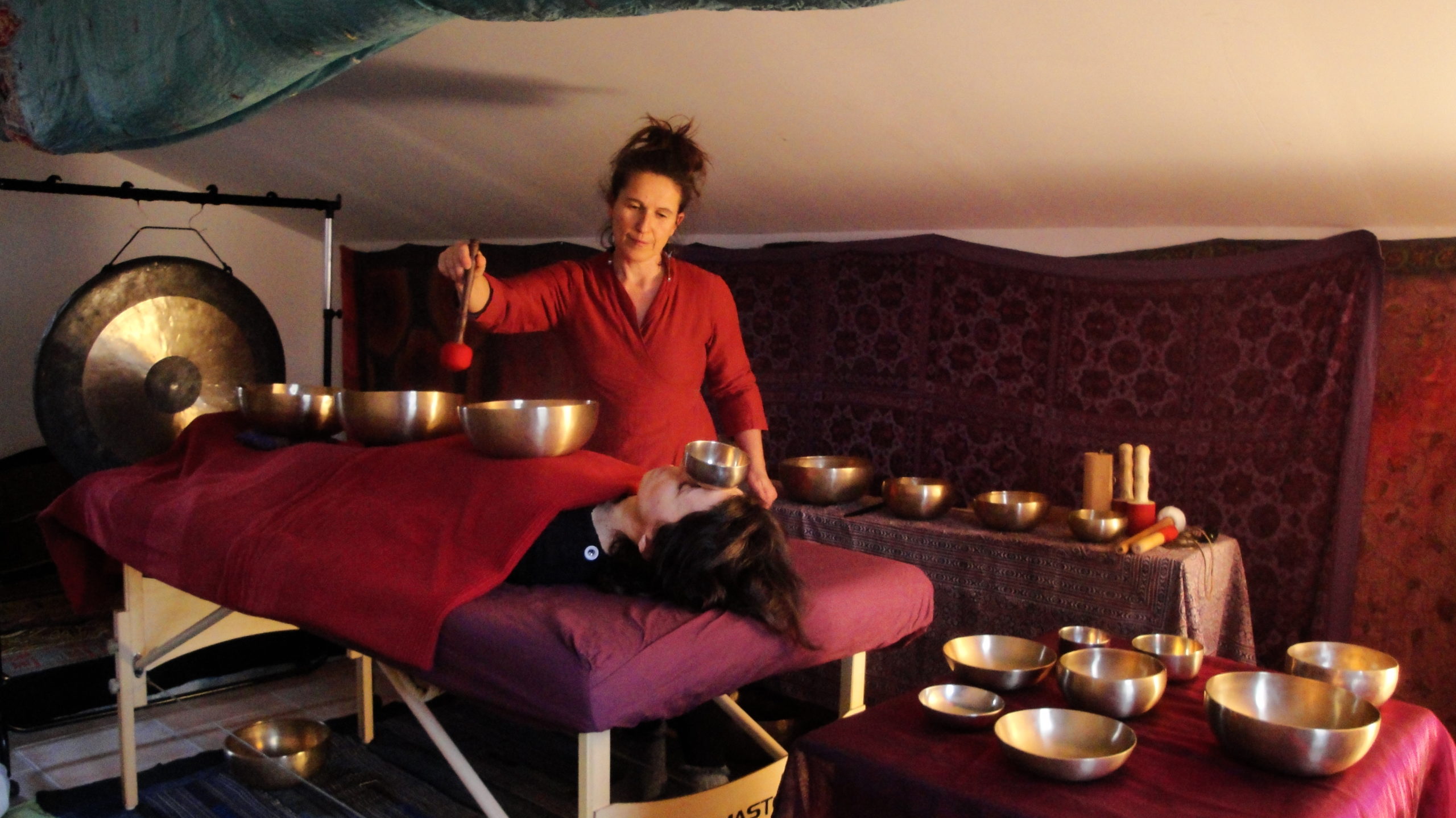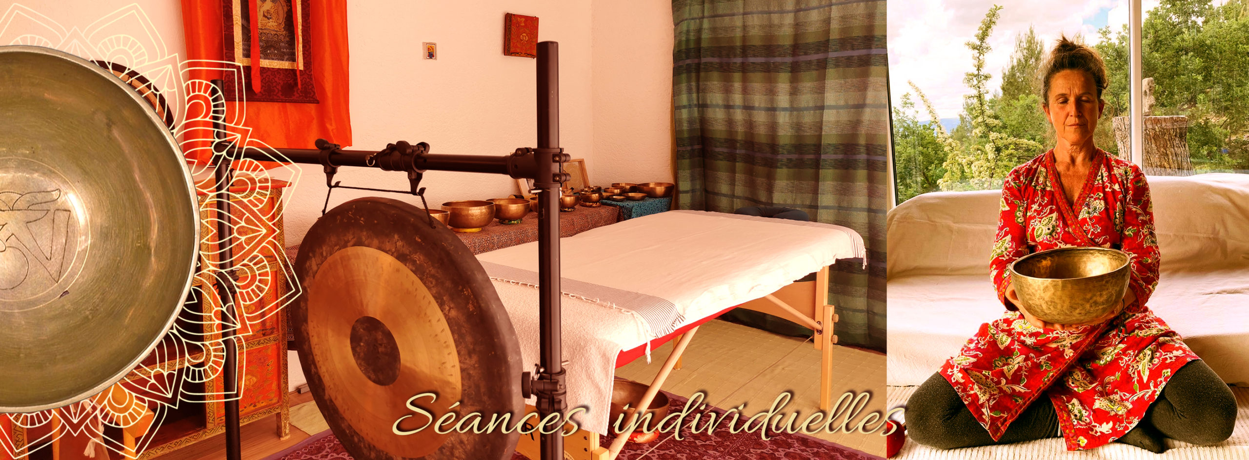 La personne est installée sur une table de massage, habillée, et couverte par un plaid. Les instruments tels que les bols tibétains, gongs, tambour, carillons.. sont installés autour.. durant la séance c'est un véritable bain sonore... Les bols tibétains sont posés sur le corps à certains moments, la voix enveloppe, dorlotte ou dynamise... l'état de relaxation profonde obtenu est propice à une lecture des chakras et un rééquilibrage énergétique. Durant 1h, ce sont des allers-retours dans différents niveaux de conscience et différents niveaux de relaxation.... À la fin de la séance, je vous restitue les différents rééquilibrages qui se sont présentés.
