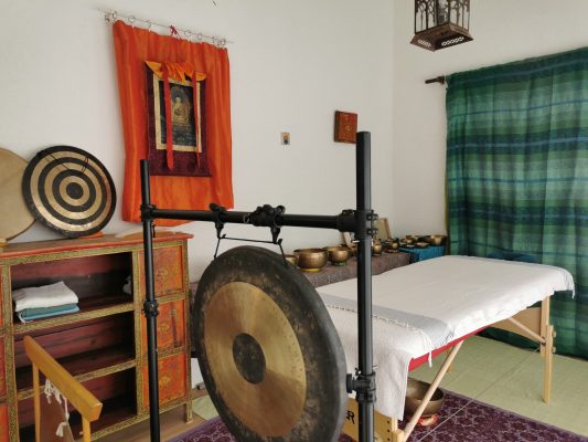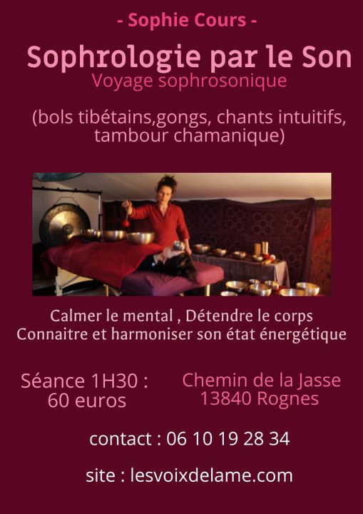 La personne est installée sur une table de massage, habillée, et couverte par un plaid. Les instruments tels que les bols tibétains, gongs, tambour, carillons.. sont installés autour.. durant la séance c'est un véritable bain sonore... Les bols tibétains sont posés sur le corps à certains moments, la voix enveloppe, dorlotte ou dynamise... l'état de relaxation profonde obtenu est propice à une lecture des chakras et un rééquilibrage énergétique. Durant 1h, ce sont des allers-retours dans différents niveaux de conscience et différents niveaux de relaxation.... À la fin de la séance, je vous restitue les différents rééquilibrages qui se sont présentés.